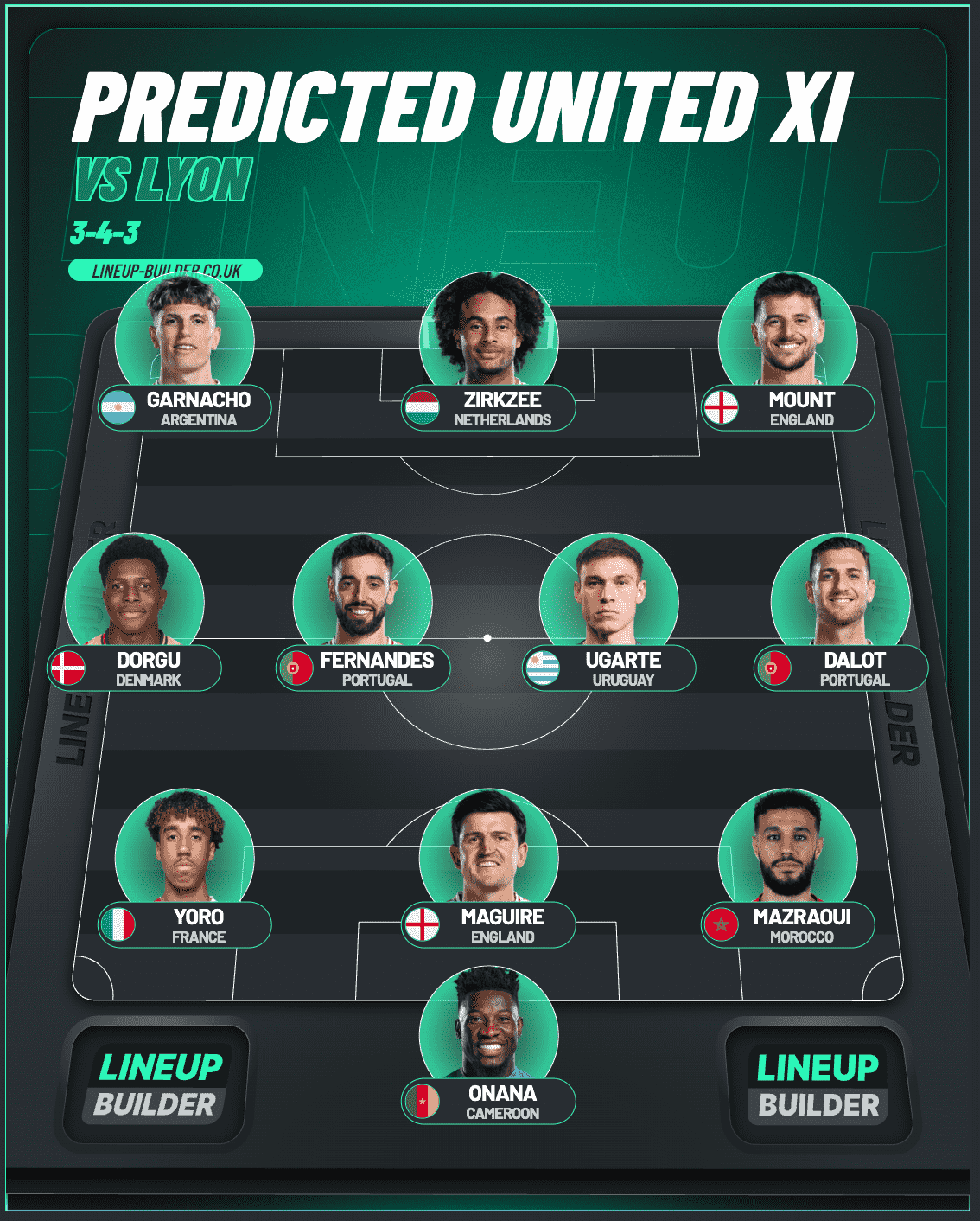 The back three is likely to remain the same, that is Harry Maguire, Leny Yoro and Noussair Mazraoui. Matthijs de Ligt and Lisandro Martinez are still injured and have not travelled.