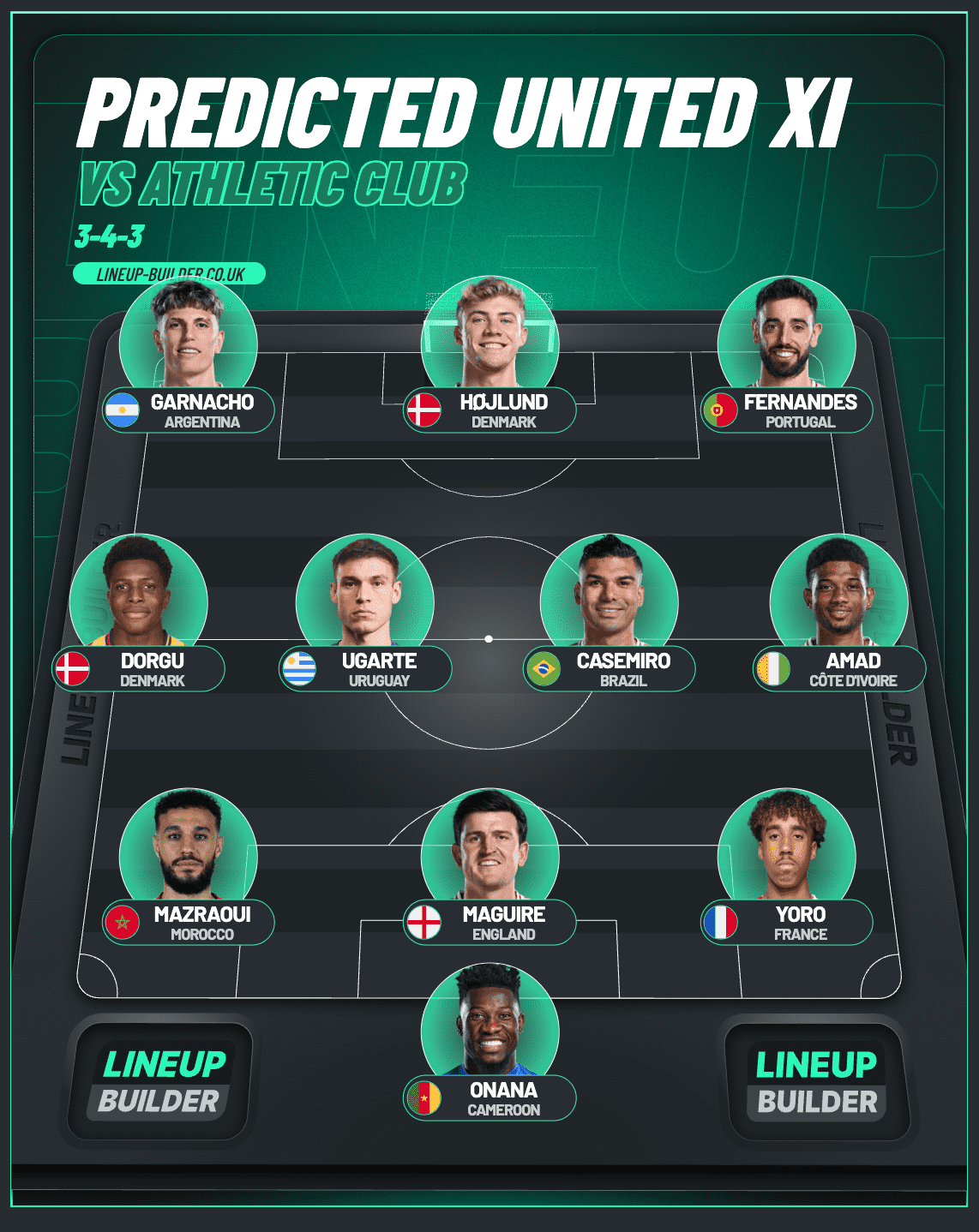 Up front, it will almost certainly be Alejandro Garnacho, Bruno Fernandes and Rasmus Hojlund.