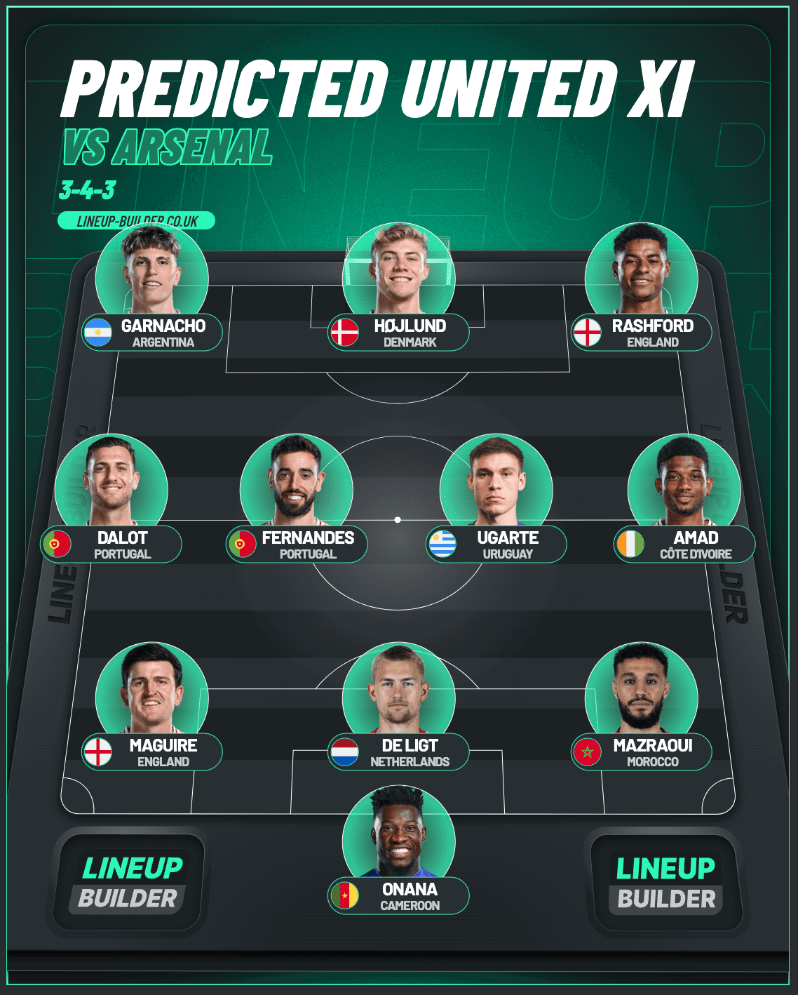 It looks as if Harry Maguire, Noussair Mazraoui and Matthijs de Ligt will be the centre backs. Leny Yoro is finally fit and is expected to be in the squad, but it is highly unlikely he will start.