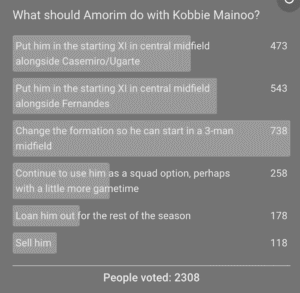 32% of fans feel that Amorim is making a big mistake leaving the player out. They are perhaps aware he is not best suited to a two man midfield so they voted for the option to play a three man midfield to play to the youngster’s strengths.