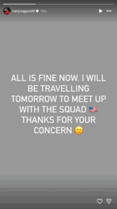 The England international wrote on Instagram, “All is fine now. I will be travelling tomorrow to meet up with the squad.”