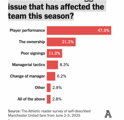 A staggering 47.3% of respondents blamed player performance, 21.2% blamed the ownership and 11.3% blamed poor signings. Only 8.3% chose managerial tactics.