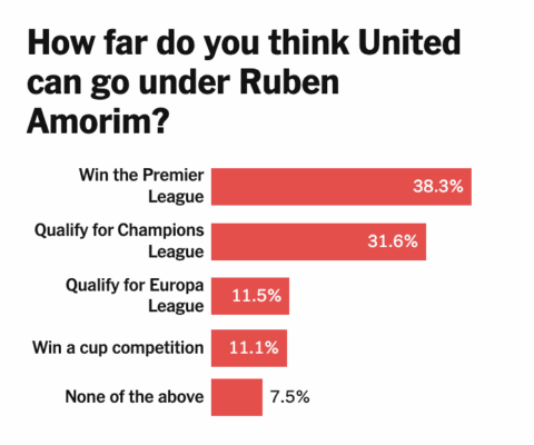 In response to the question “How far do you think United can go under Ruben Amorim?”, 38.8% said they think he will lead their club to the Premier League title.