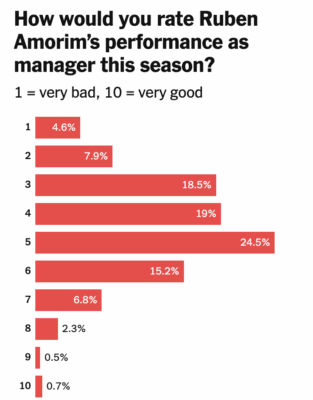 This is according to a fan survey run by The Athletic, who asked fans the question “How would you rate Ruben Amorim’s performance as manager this season?”